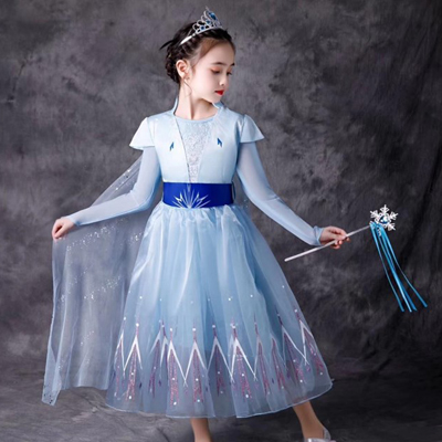 Đầm công chúa bé gái kiểu dáng tạo hình elsa duyên dáng, thân trước bằng thun in hình, thân dưới voan xòe, phía sau khan choang dài thướt tha, có thể tháo rời.